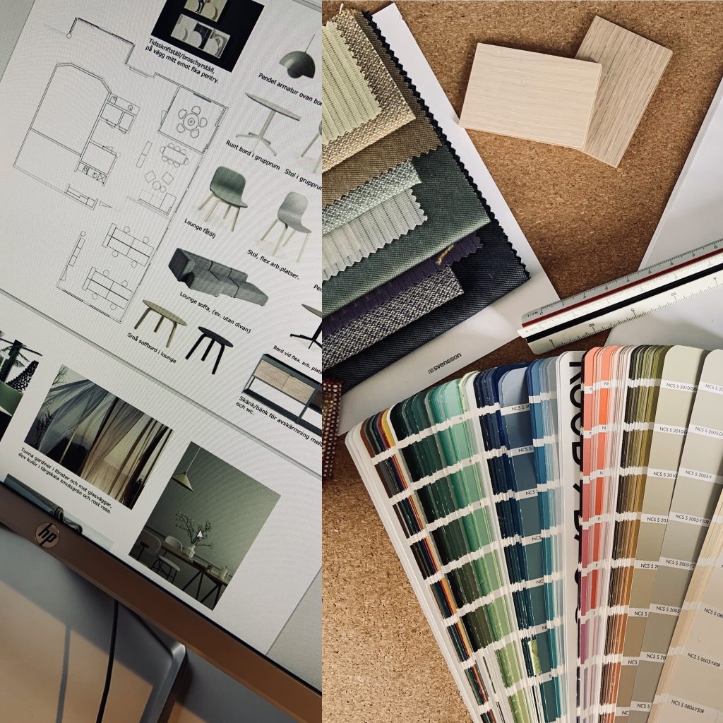 I nästa steg föreslår jag ett inredningskoncept. För enklare visualisering presenterar jag moodboards som innefattar planritningar, produktval, ljussättning, ljuddämpning samt färg- och materialprover.