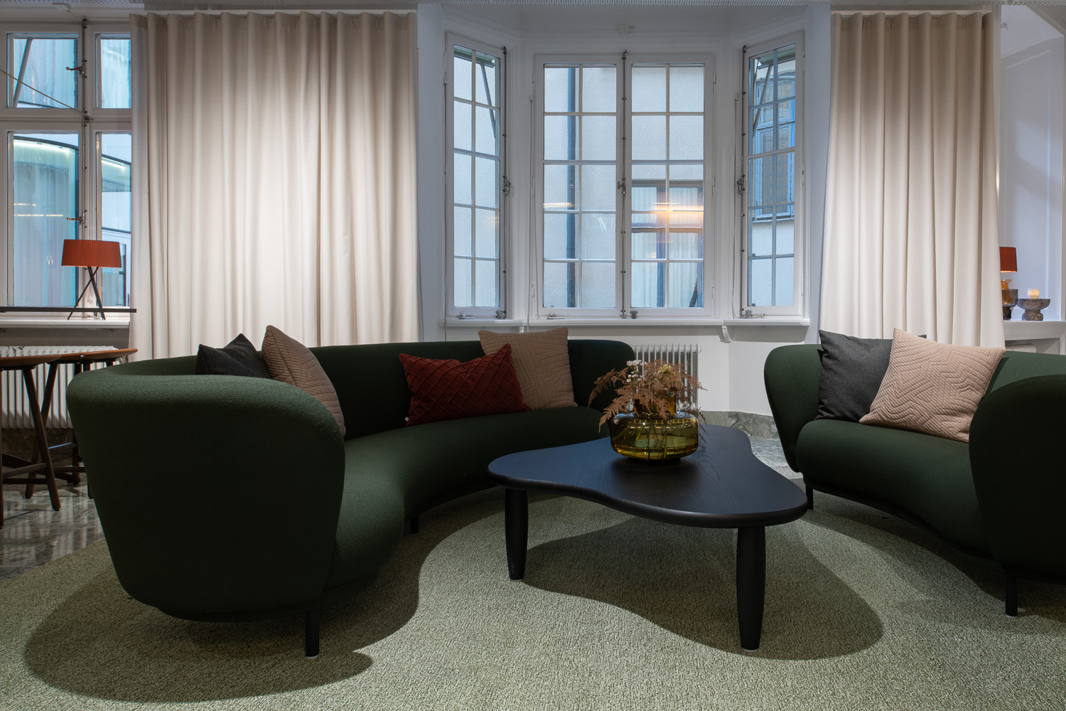 Tillsammans med Hökars Inredningar utvecklade ett koncept med många och varierande sitt- och ståplatser, som mötte behovet av flexibilitet, men som ändå höll ihop formmässigt. Det vackra marmorgolvet gav inspiration och fick lägga grund för färgsättningen av textiler, mattor och övrig inredning.